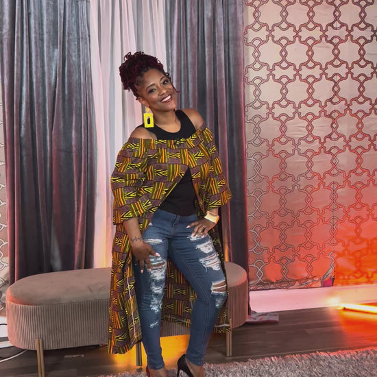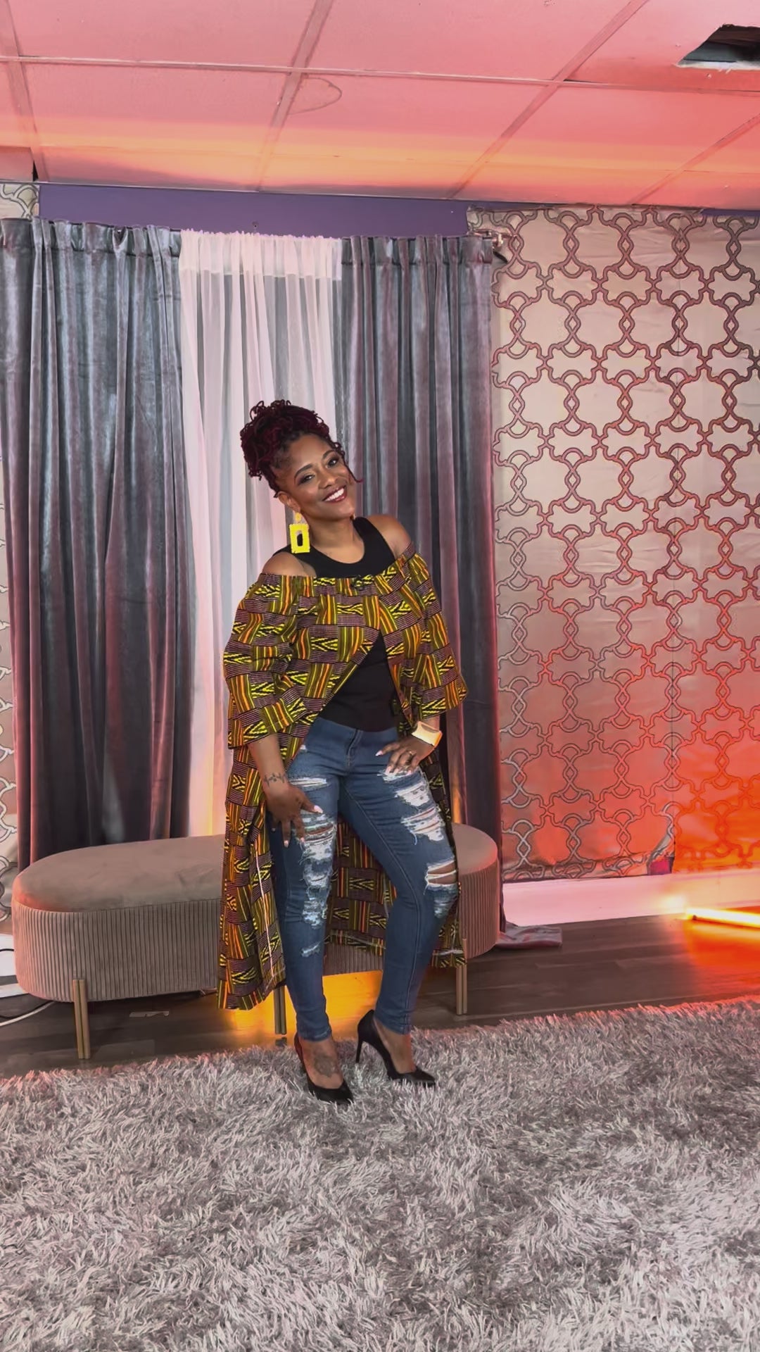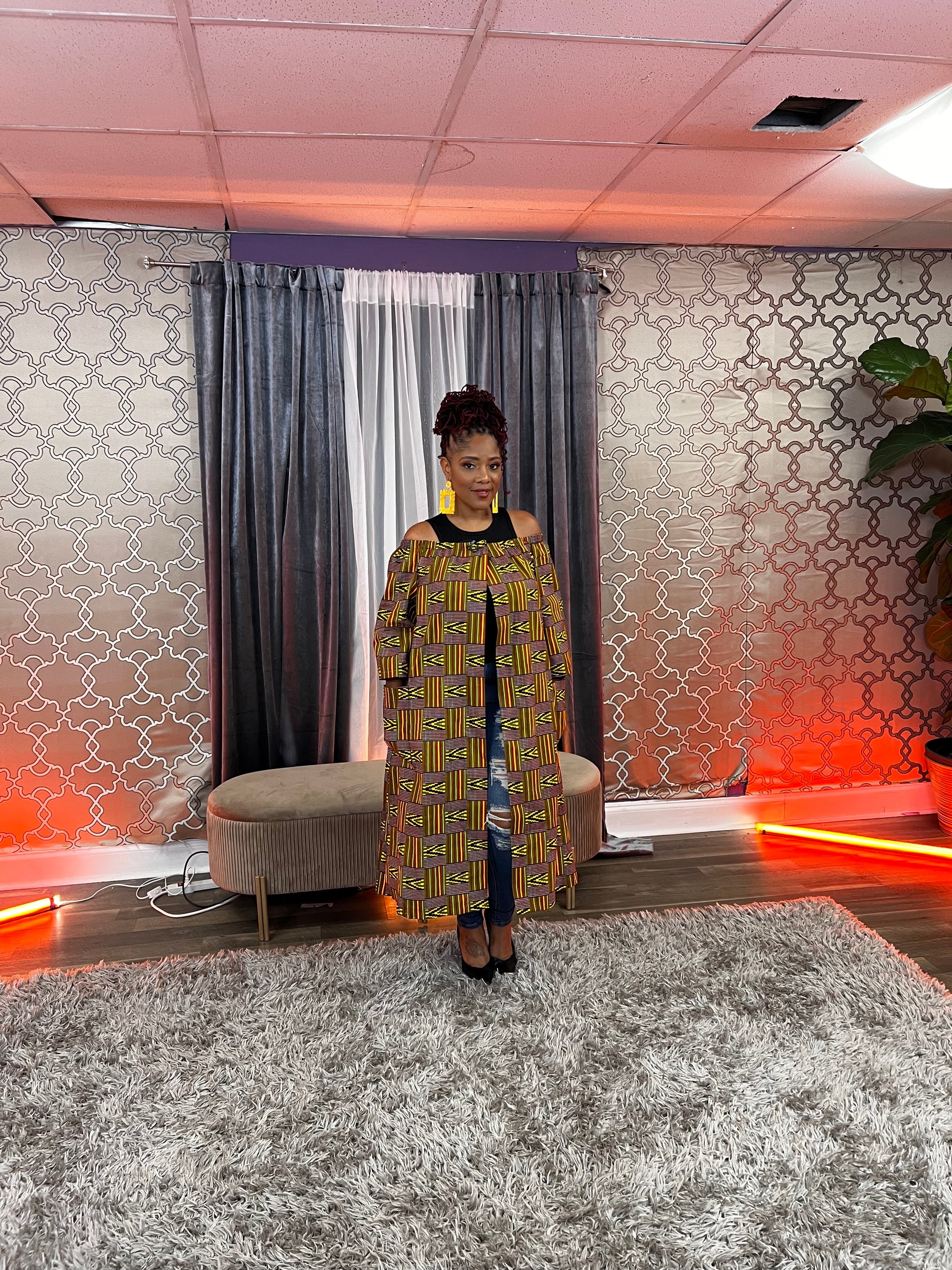 This custom ONE SIZE FITS MOST off the shoulder cape has two front pockets with hook closure. Can be styled as dressy or casual. Any African print of YOUR choice can be used to create this look.